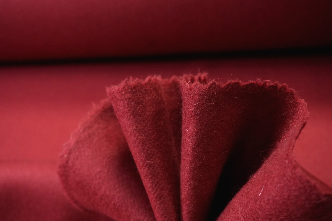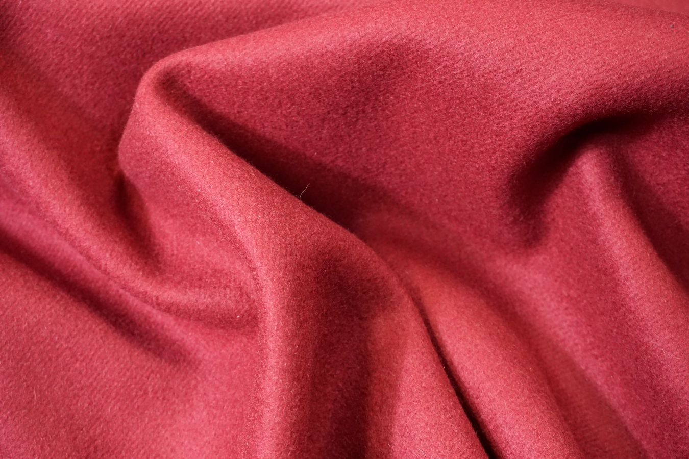 100% Kaschmir; schwerer Mantelstoff mit etwas Stand, weicher Griff und leichte Diagonalstruktur; Farbe karminrot; Breite 150 cm