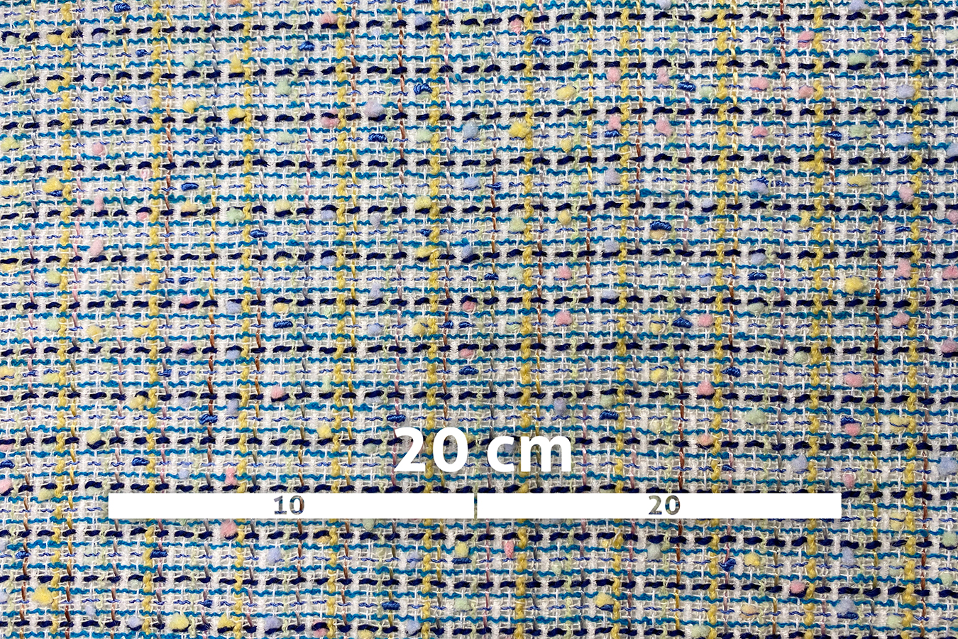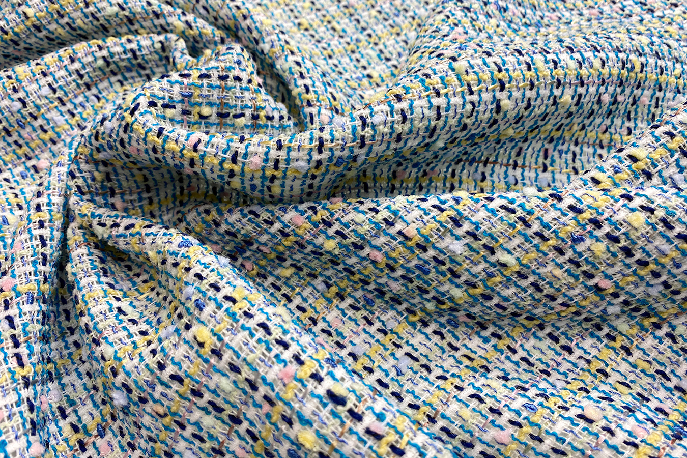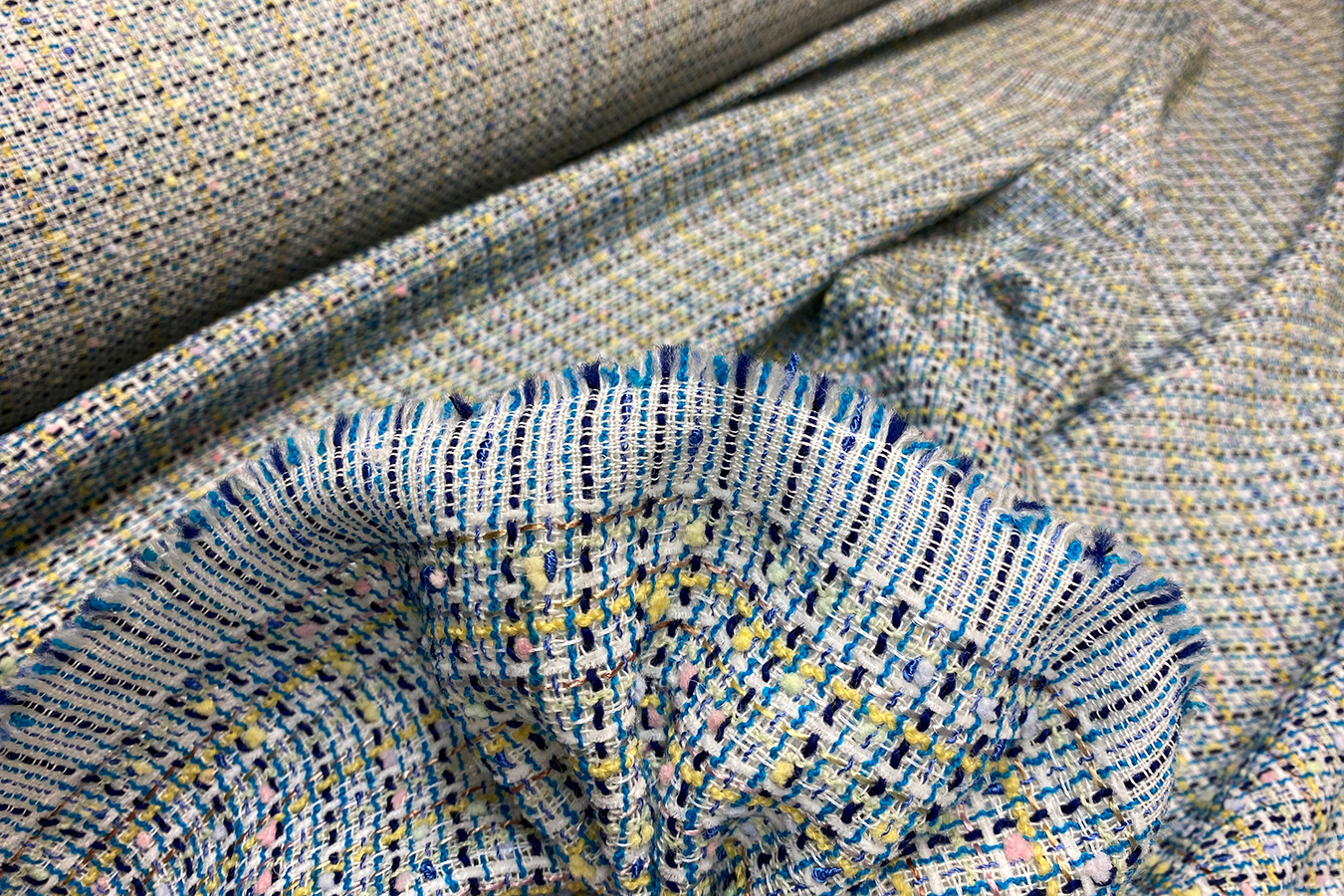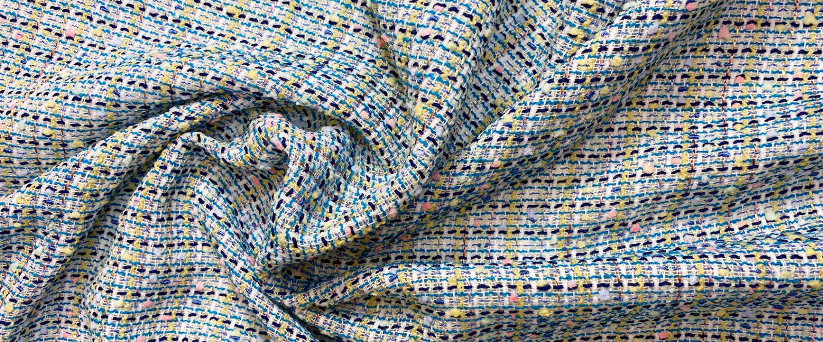 56% Baumwolle/17% Polyester/16% Acetat/11% Viskose; sommerliche locker gewebte Kostümware aus Noppen-, Glanz- und Bouclegarnen in türkis, hellgelb, rose, zartgrün und dunkelblau mit ecru; Breite 140 cm; geeignet für klassische Kostüme, leichte Mäntel, Kleider