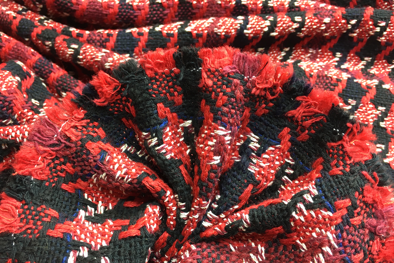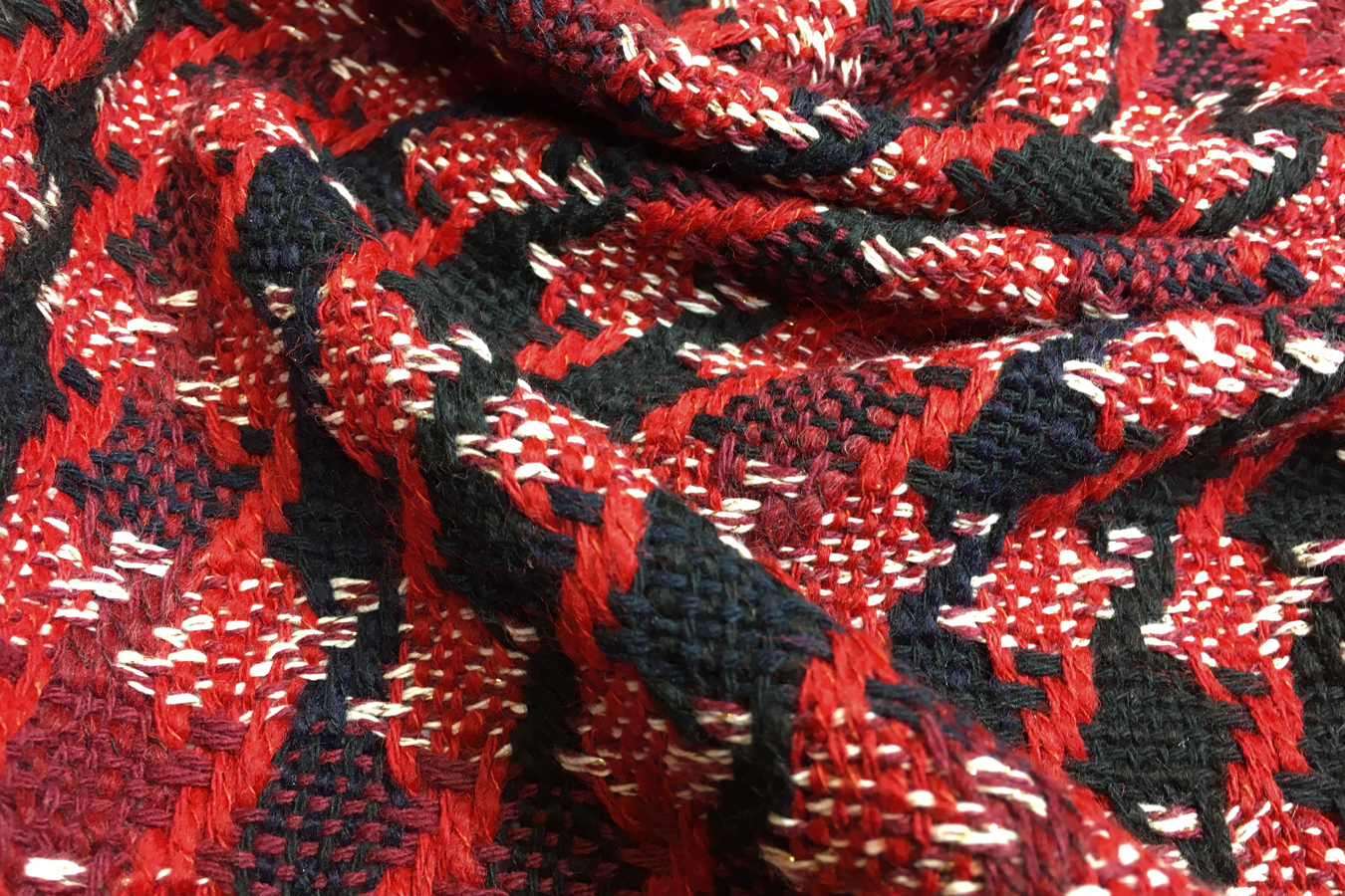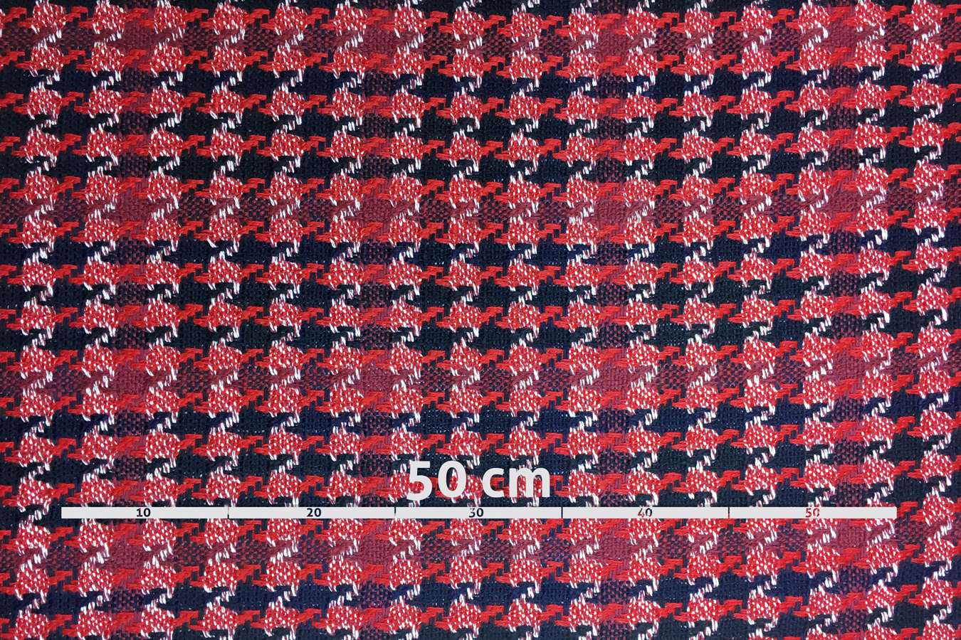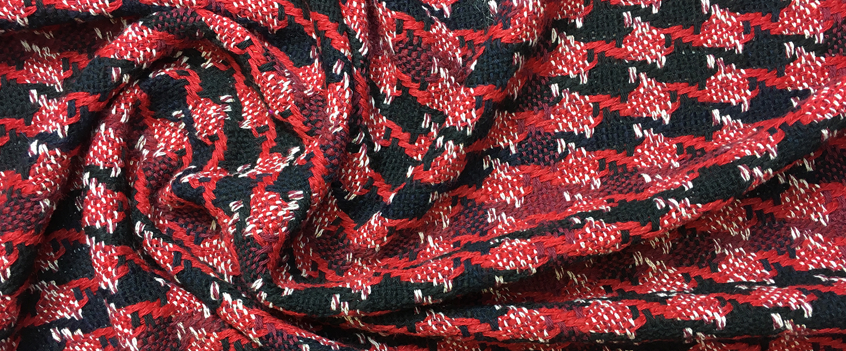 99% Schurwolle/1% Lurex; locker gewebte Kostümware im Hahnentritt-Muster; Farben rot, dunkelrot, schwarz und etwas weiß mit feinem goldenen Lurexfaden; Breite 142 cm; geeignet für klassische Kostüme, Mäntel, Mantelkleider