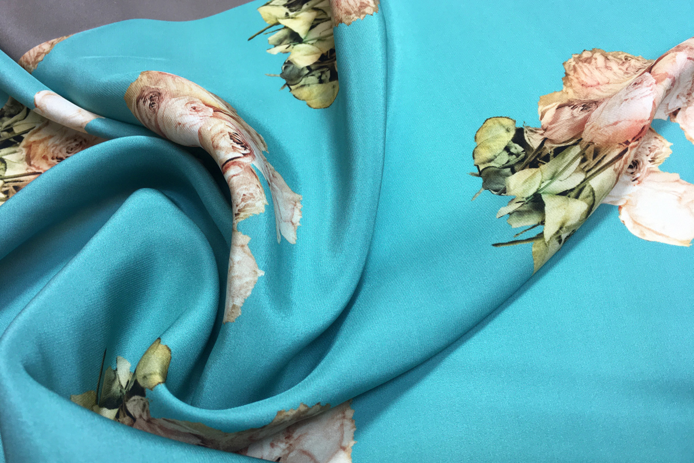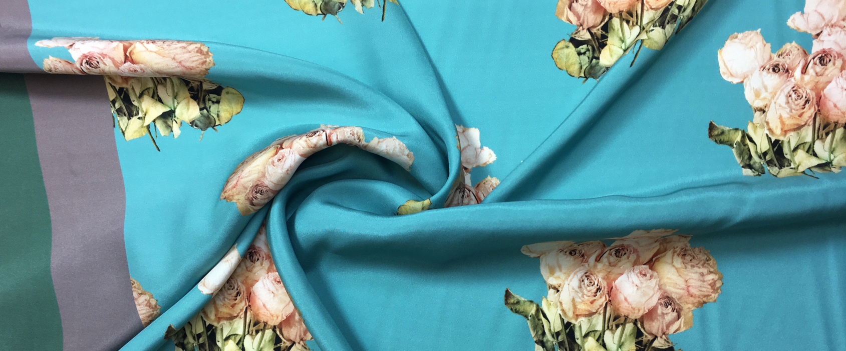 100% Seide; feiner Crepe mit Satinabseite; Bordürendruck mit einseitiger Streifenkante; Farbe apricotfarbene Rosenbouquets auf türkisfarbenem Grund mit je 5cm breitem graubraunen und flaschengrünen Streifenabschluß entlang einer Webkante; Breite 138 cm