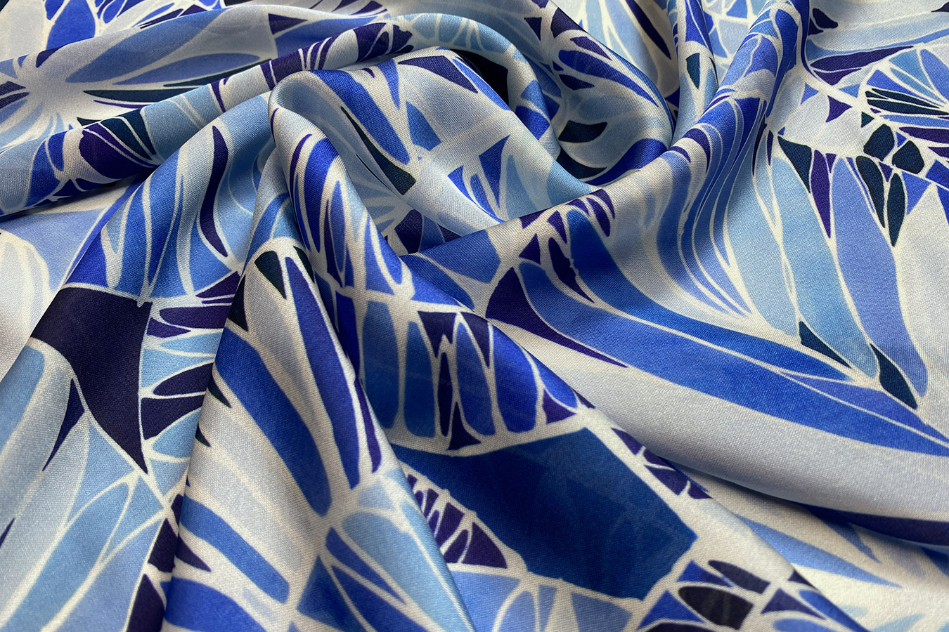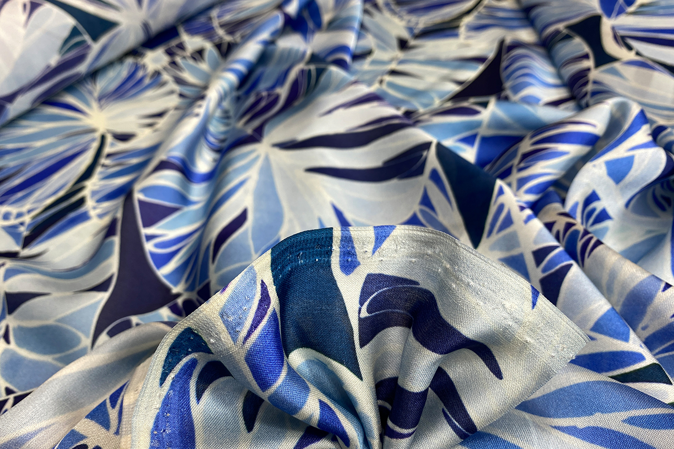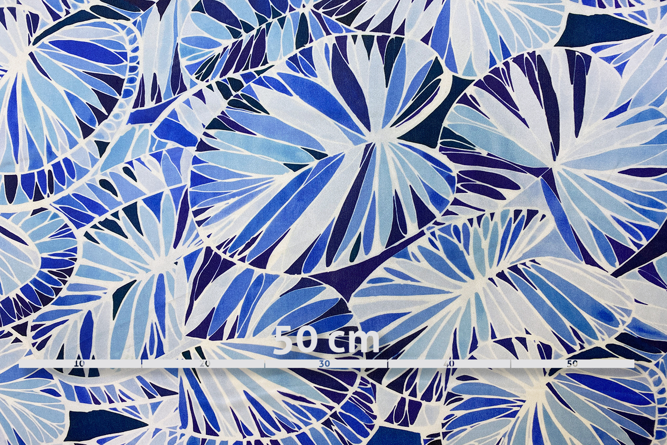 100% Seide; leichter, weichfallender Satin mit stilisiertem großen Blätterdruck in Blautönen auf altweiß; Breite 136 cm; geeignet für Kleider, Blusen, weite Röcke