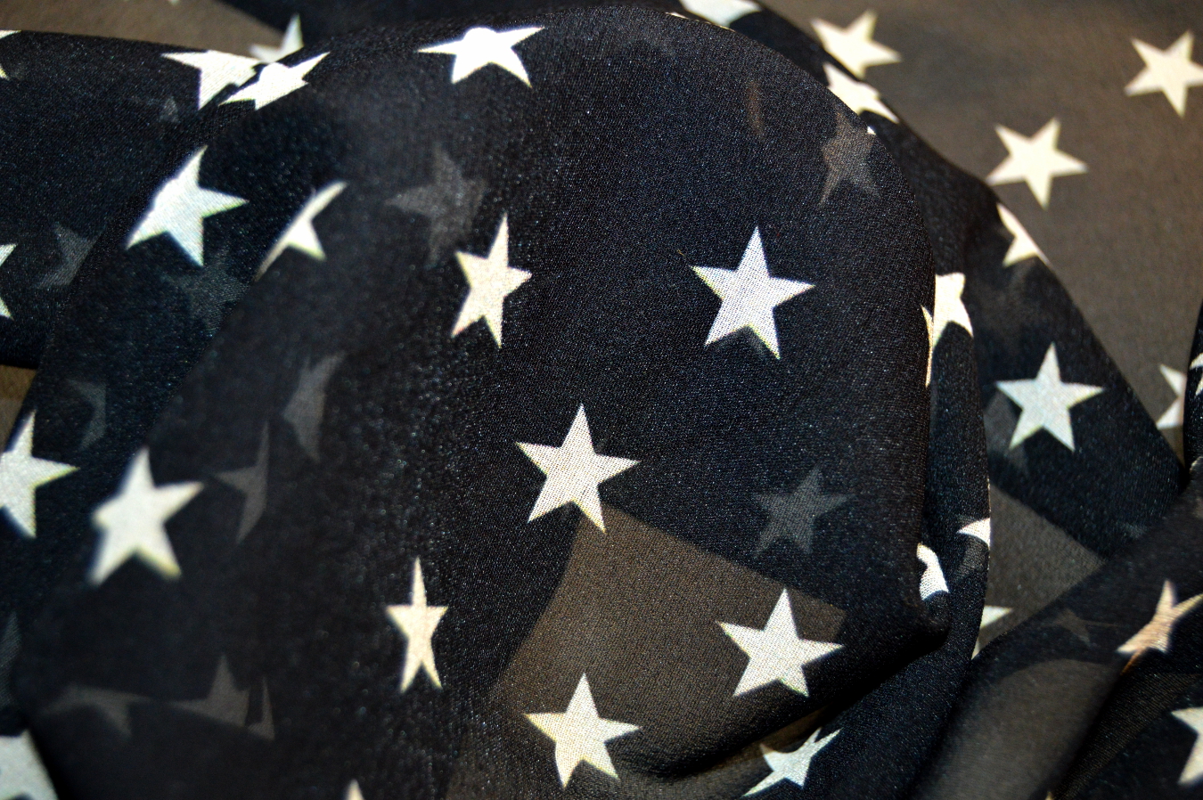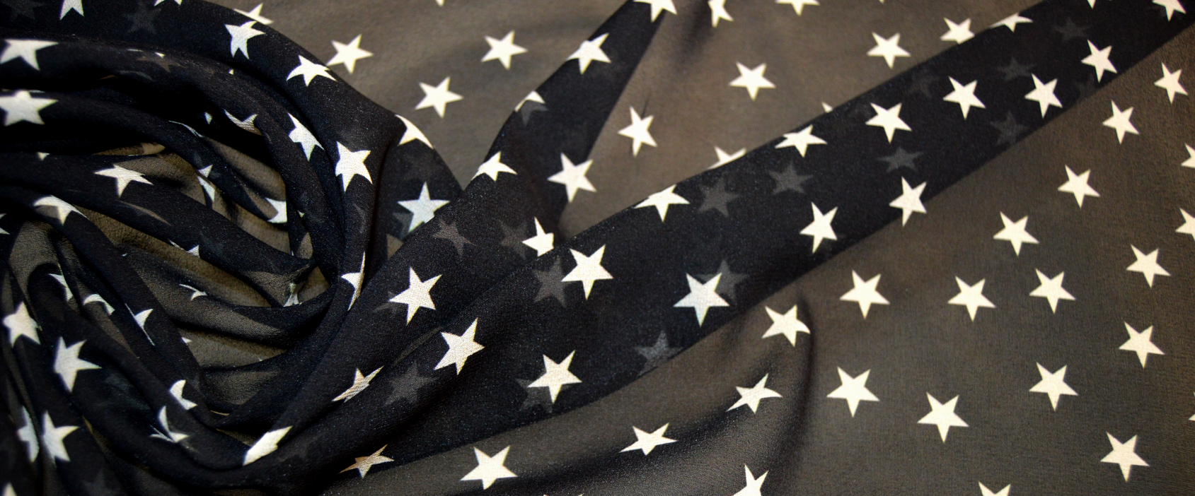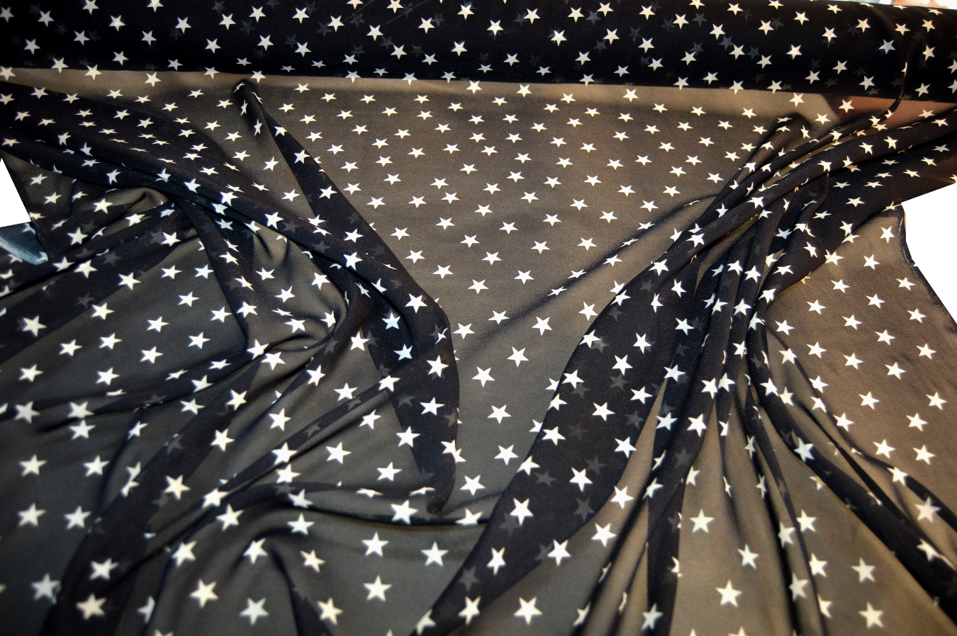 92% Seide/8% Elastan; hochelastischer Chiffon; Farbe weiße Sterne von 1,5 cm Durchmesser auf schwarz; Breite 132cm; geeignet für Blusen, leichte Kleider, Röcke; halbtransparente Einsätze,