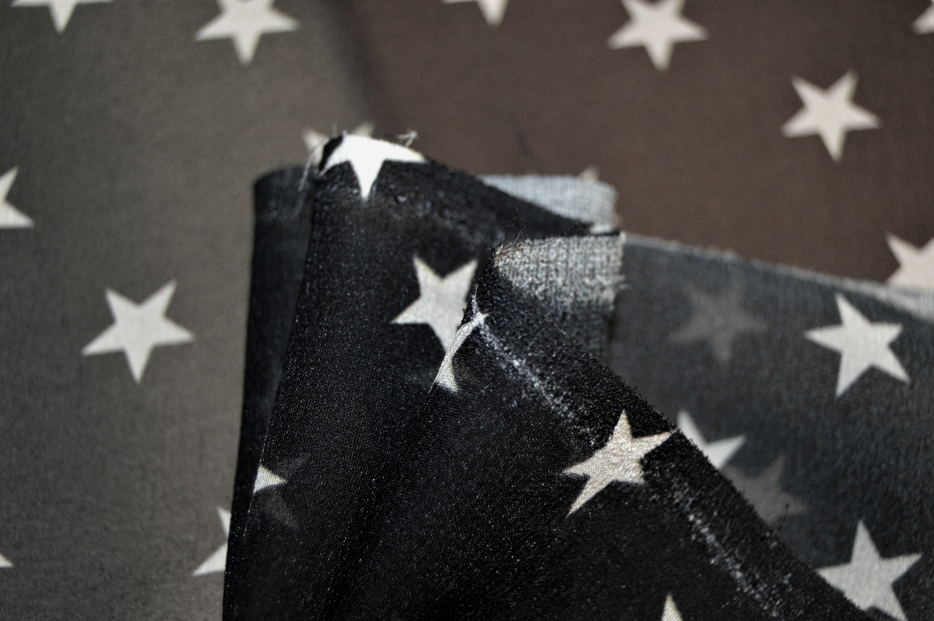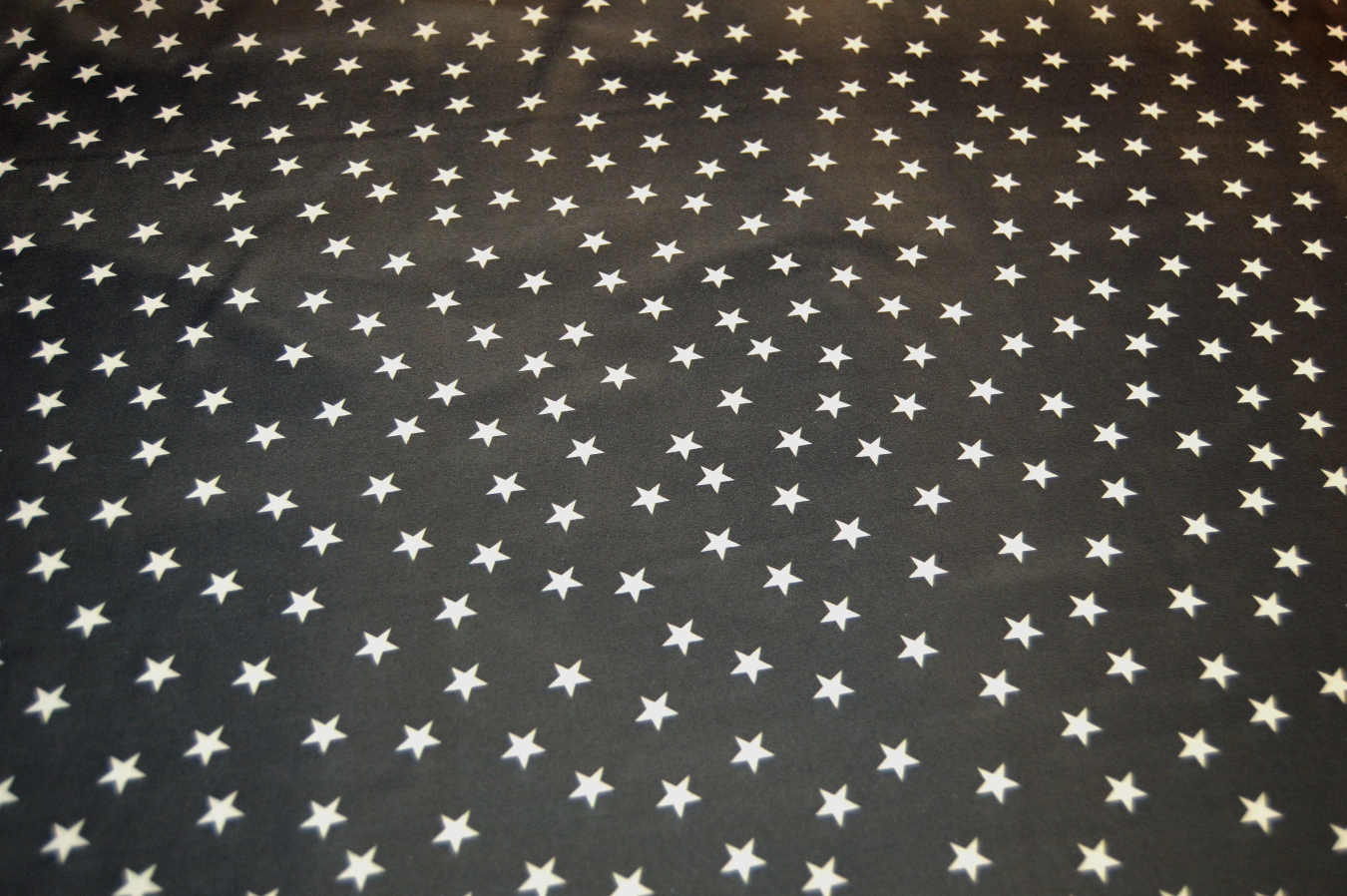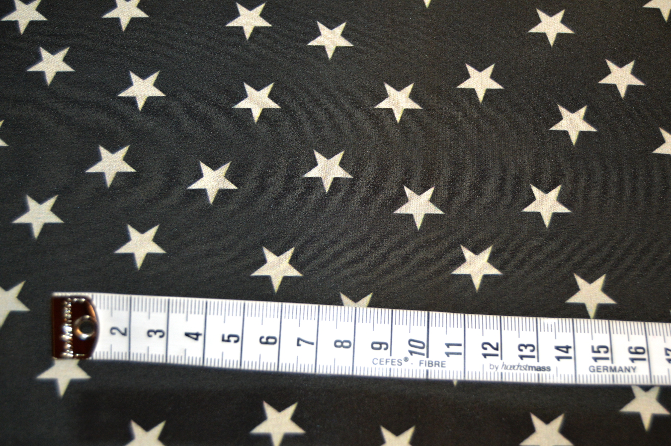 92% Seide/8% Elastan; hochelastischer Chiffon; Farbe weiße Sterne von 1,5 cm Durchmesser auf schwarz; Breite 132cm; geeignet für Blusen, leichte Kleider, Röcke; halbtransparente Einsätze,