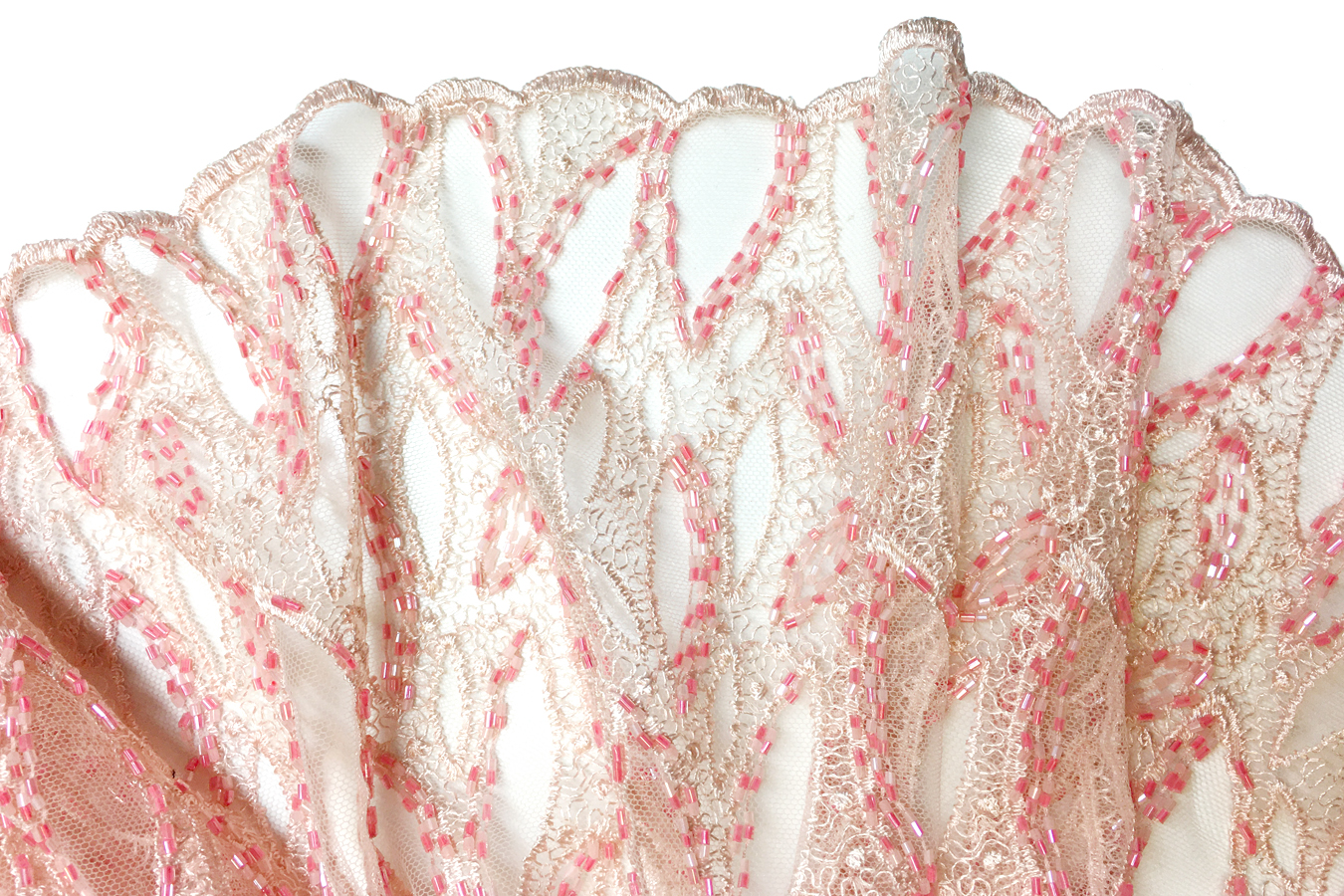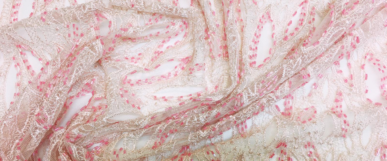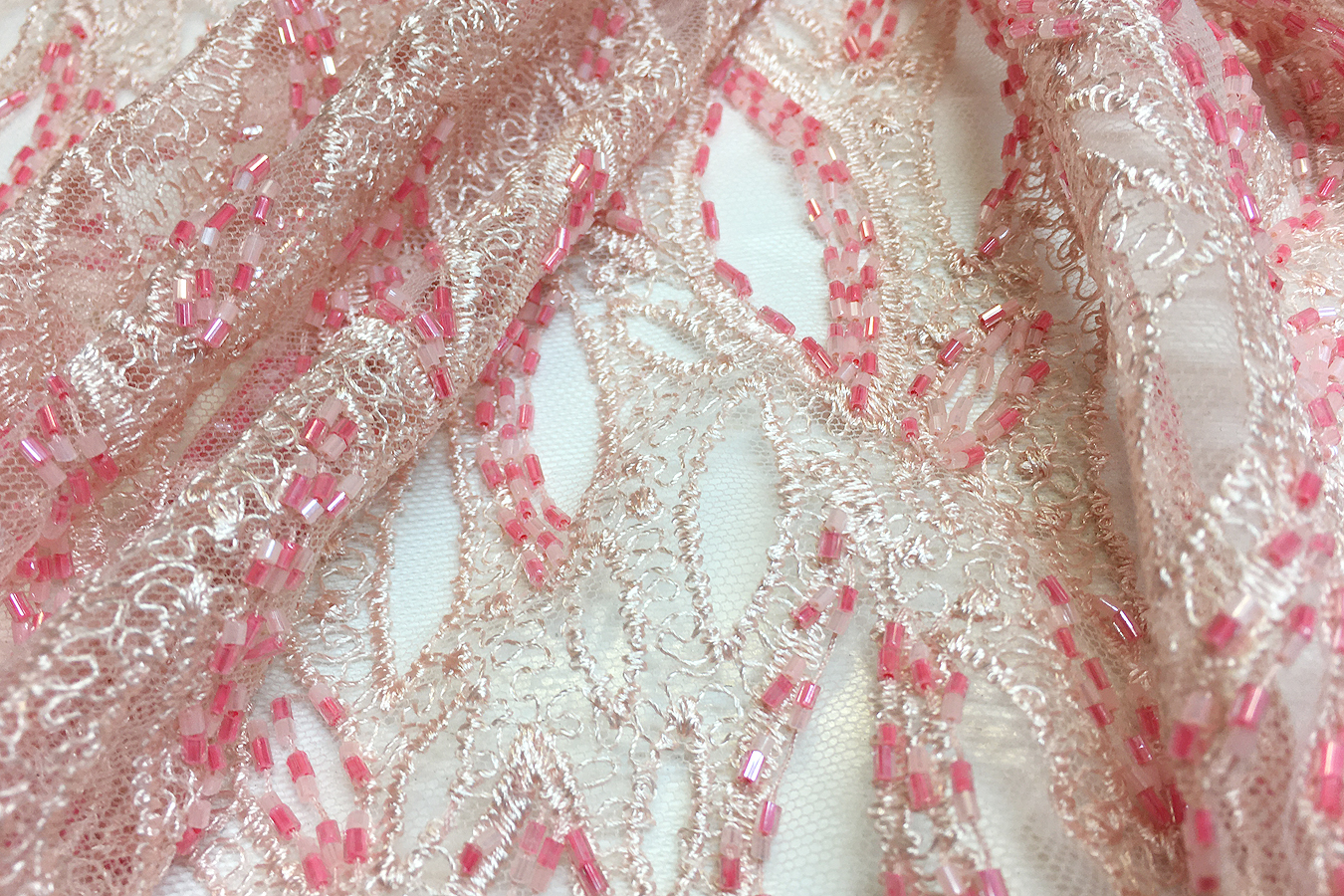 100% Polyamid; Glasperlen, Lurexgarn; Tüllstickerei mit beidseitigem Langettenrand und Stiftperlen; organisches Muster; Farbe lachsrosa; Breite 125 cm; geeignet für festliche Kleider, Röcke, Oberteile