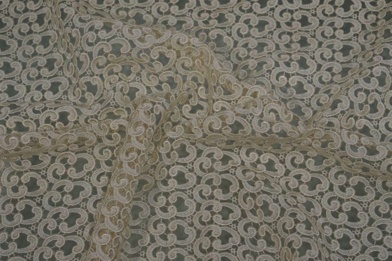 100% Viskose; Spachtelspitze; Farbe creme; beidseitige Bogenkante; Breite 96 cm