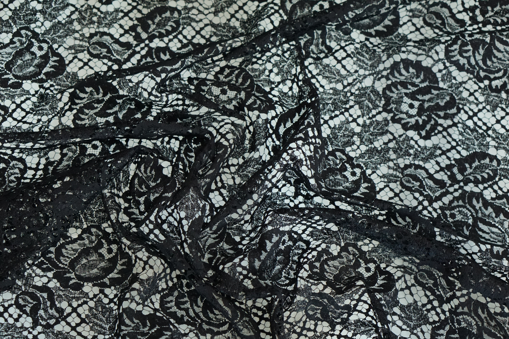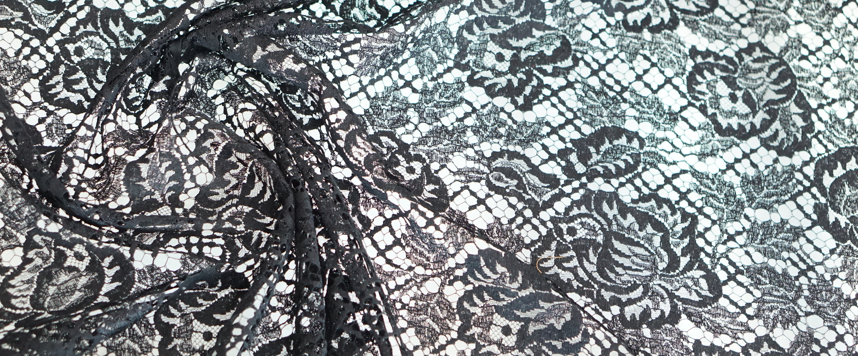 70% Baumwolle/30% Polyamid; Spachtelspitze; Rosen mit Blättern; Farbe schwarz; beidseitige Bogenkante; Breite 95 cm