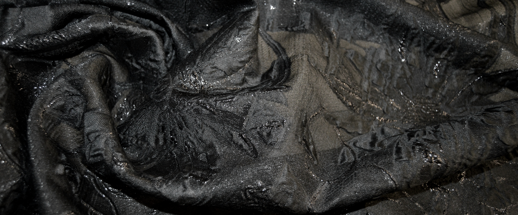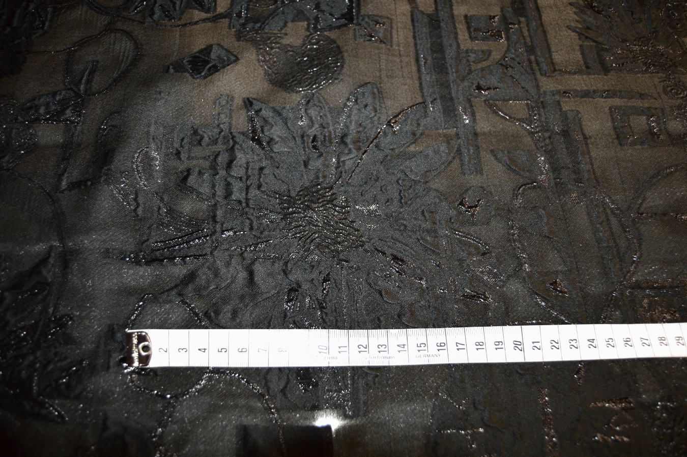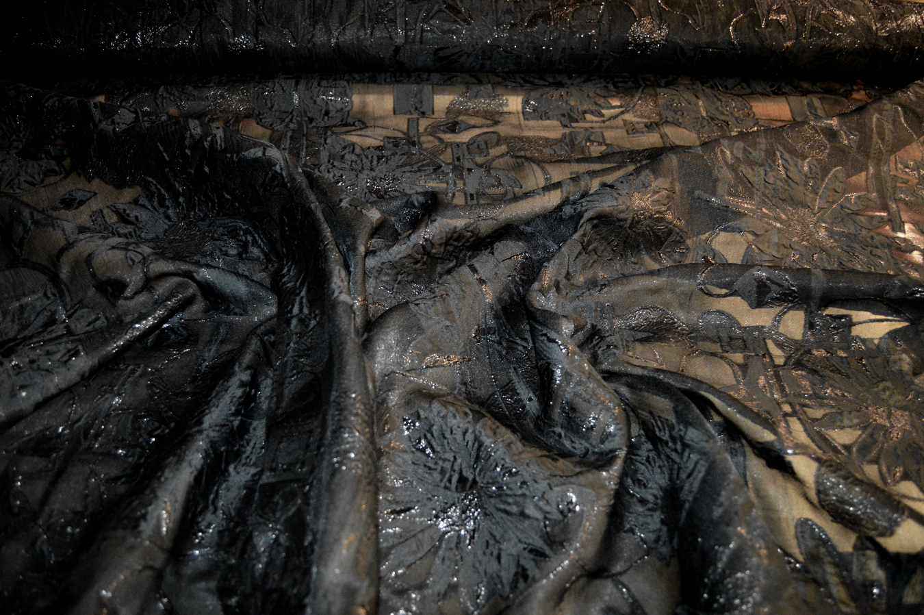 65% Polyester/17% Seide/10% Metall/8% Polyamid; hochwertige Ausbrennerware mit großen Cloqueblüten; Farbe matt schwarz mit Akzenten in schwarzem Lurexgarn; Ware mit Stand; Breite 135cm; geeignet für festliche Garderobe;