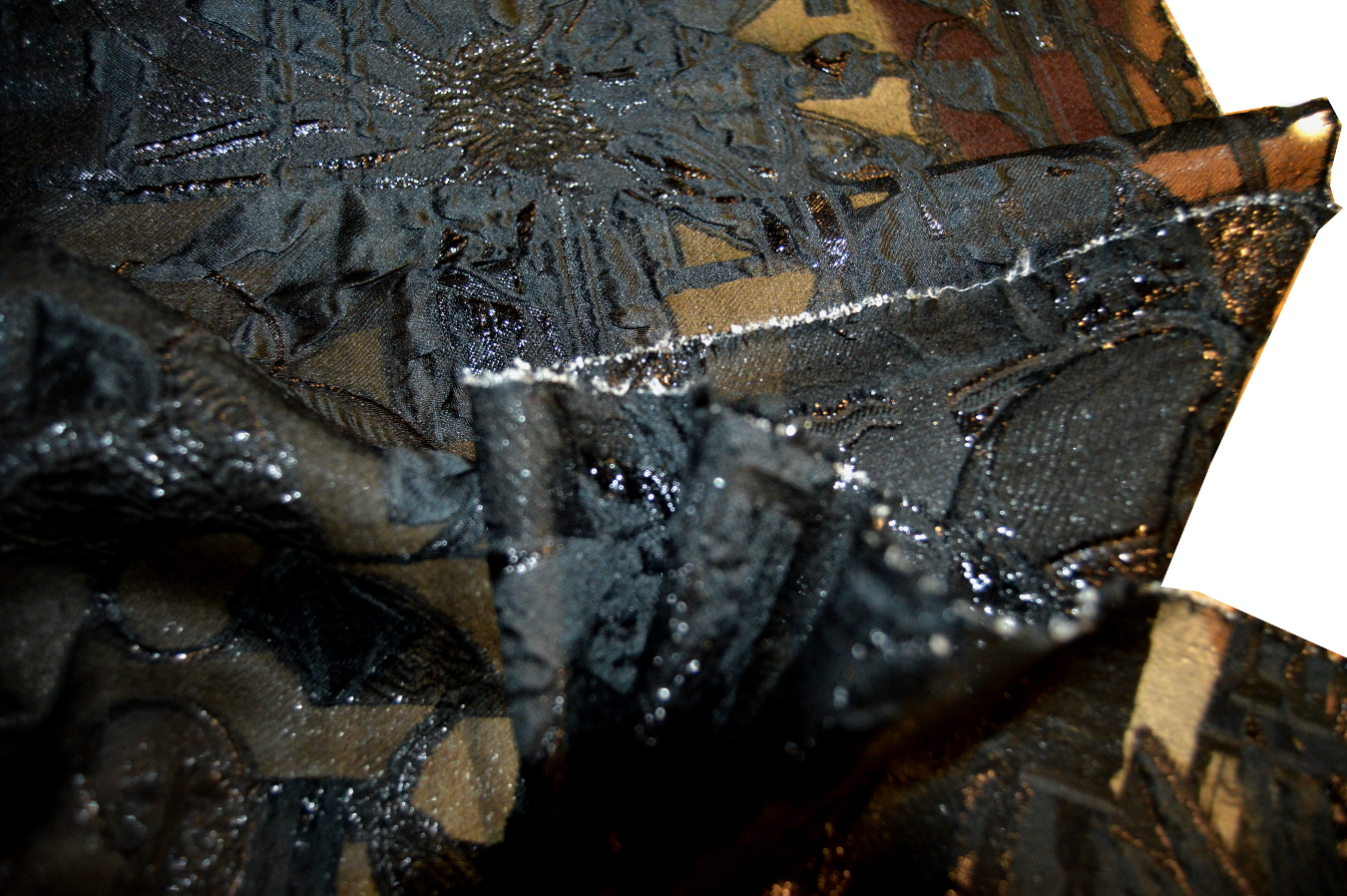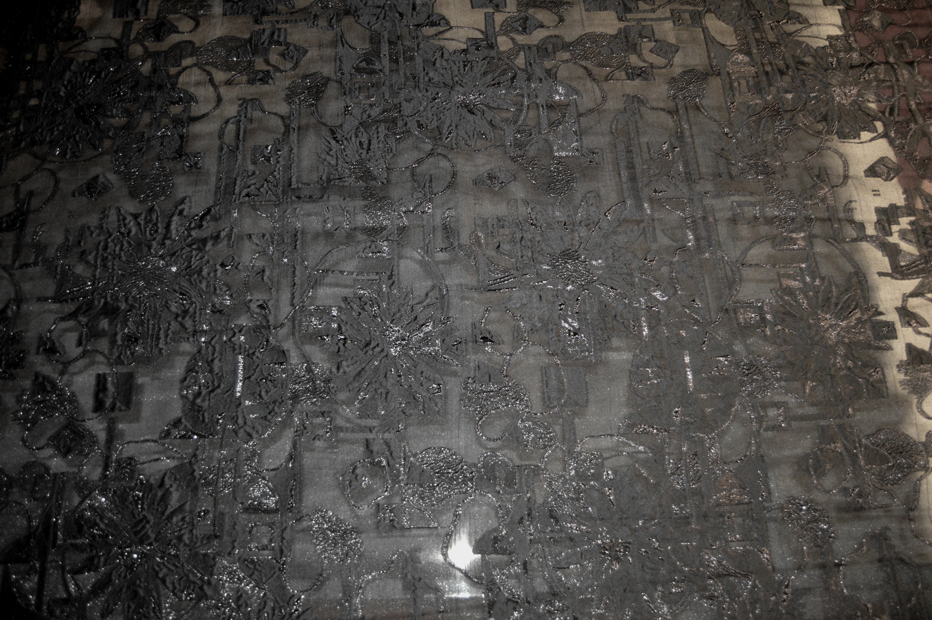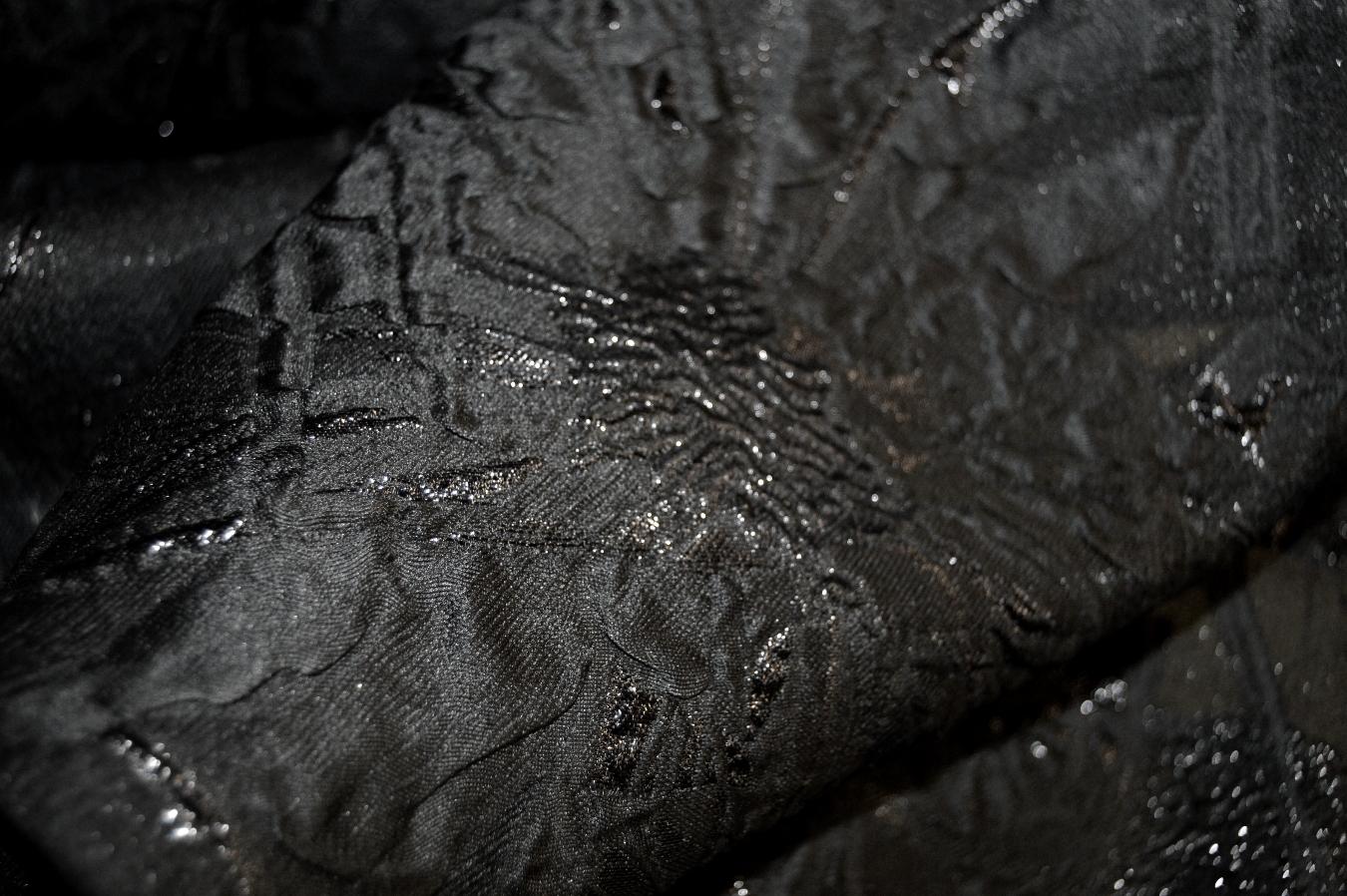 65% Polyester/17% Seide/10% Metall/8% Polyamid; hochwertige Ausbrennerware mit großen Cloqueblüten; Farbe matt schwarz mit Akzenten in schwarzem Lurexgarn; Ware mit Stand; Breite 135cm; geeignet für festliche Garderobe;