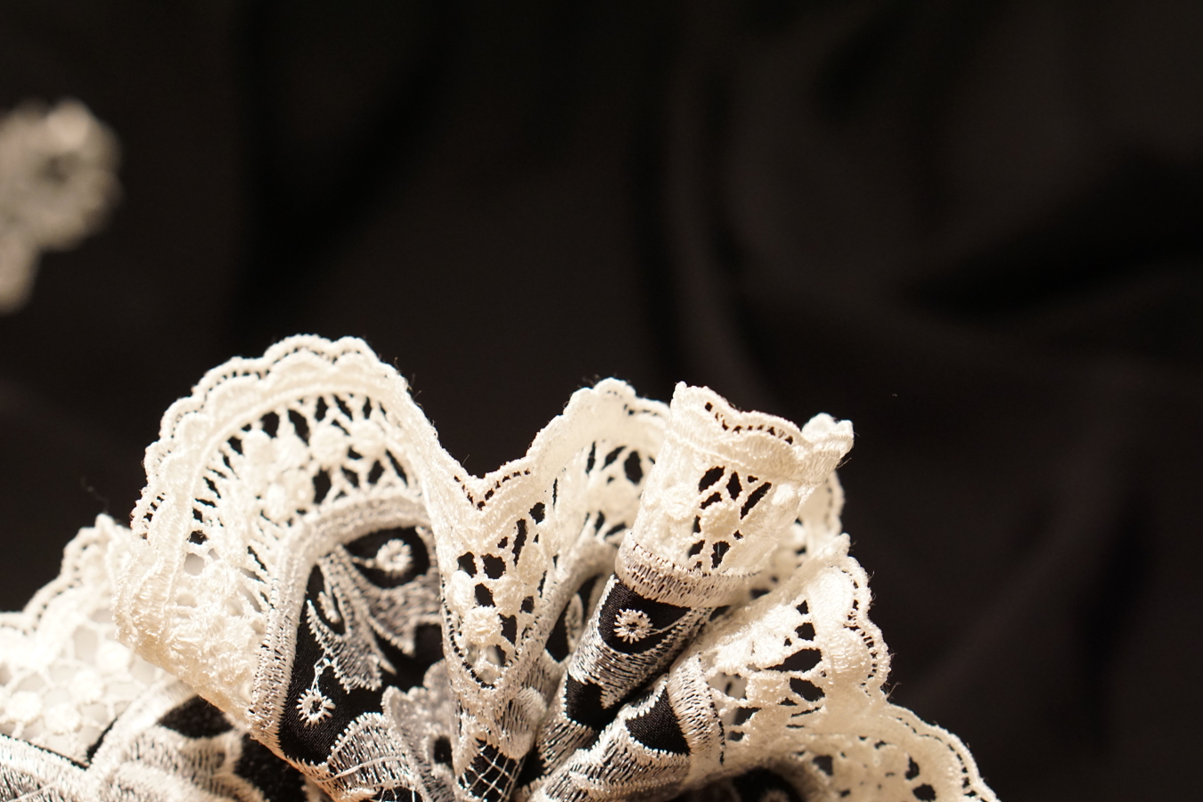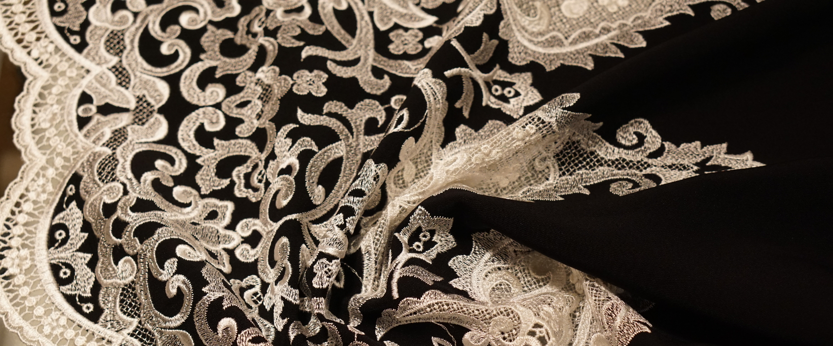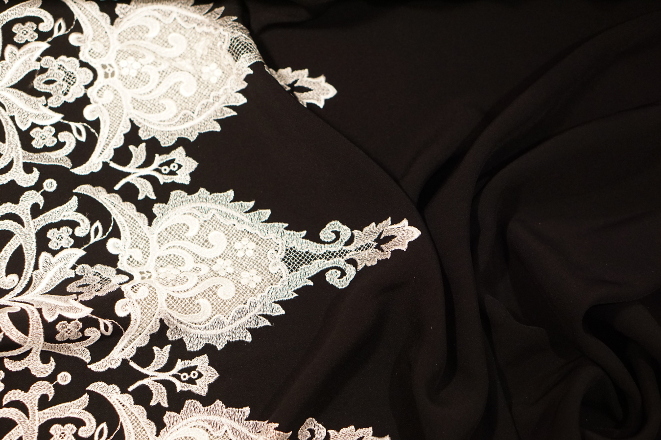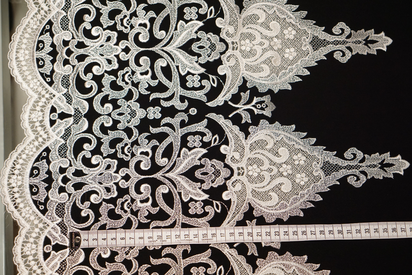 100% Mikrofaser; schwerfallender, seidenmatter Cady mit bis zu 45 cm weißer Spitzenbordüre an einer Seite; Farbe schwarz bzw. weiße Spitze; Breite 130 cm; geeignet für (Abend-) Kleider, Complets, Kostüme, Hosenanzüge, Overalls, weite Röcke