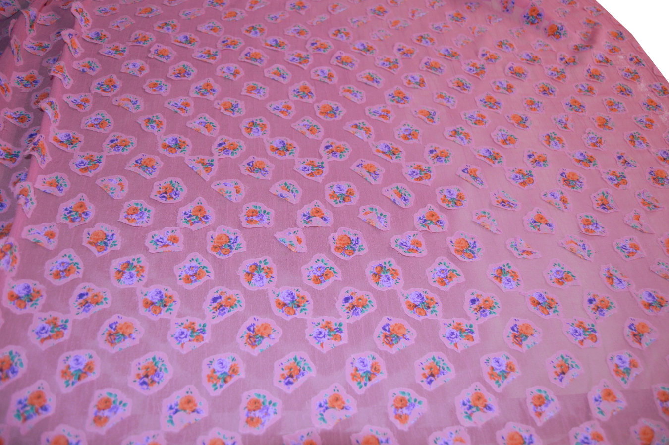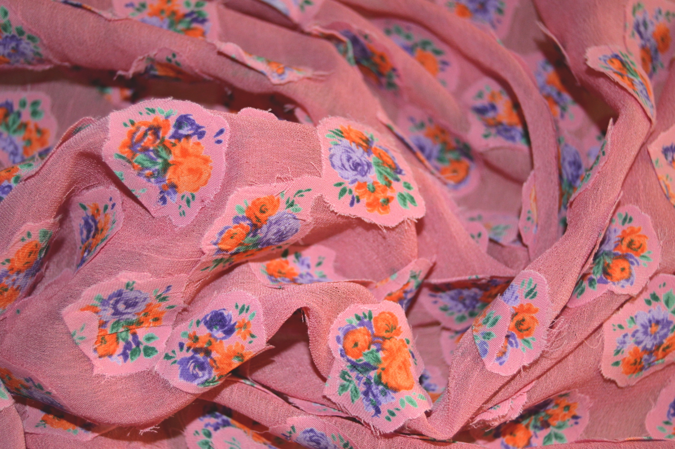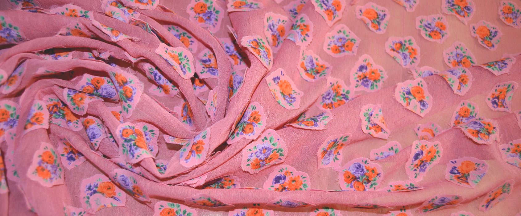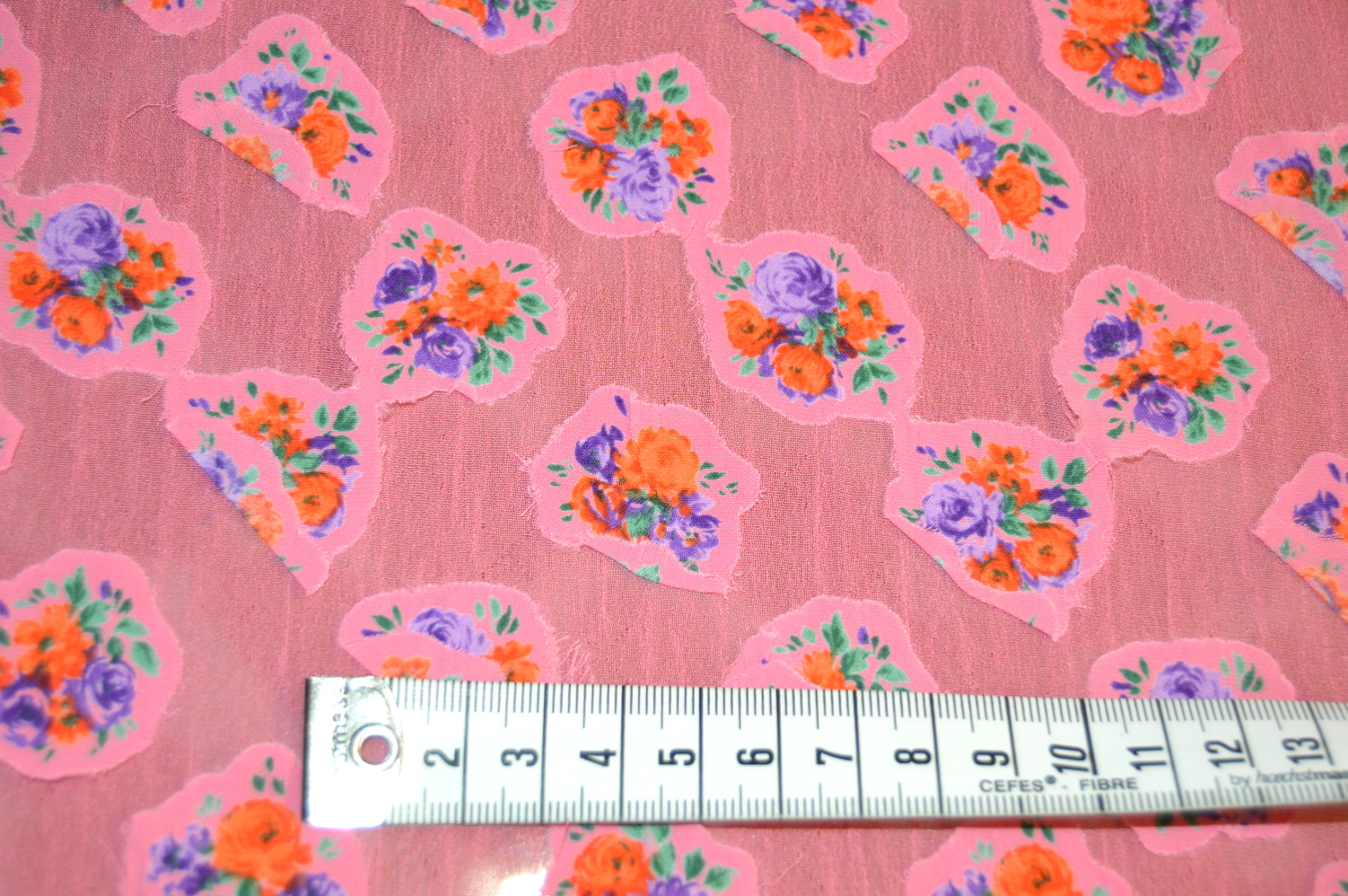 55% Polyester/45% Viskose; Chiffon mit Applikation; Farbe rosa mit orange, grün und blau; Breite 137 cm