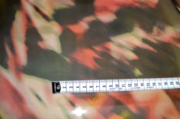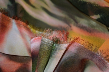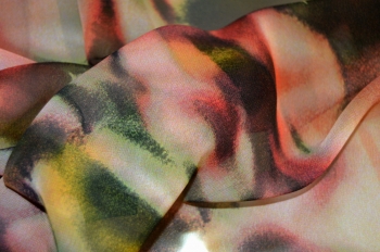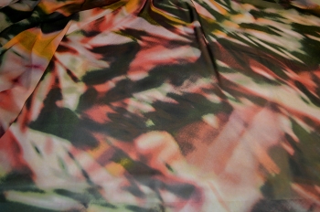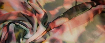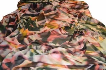 100% Polyester; Chiffon; Farbe überweigend oliv, rot und gelb; Breite 144 cm