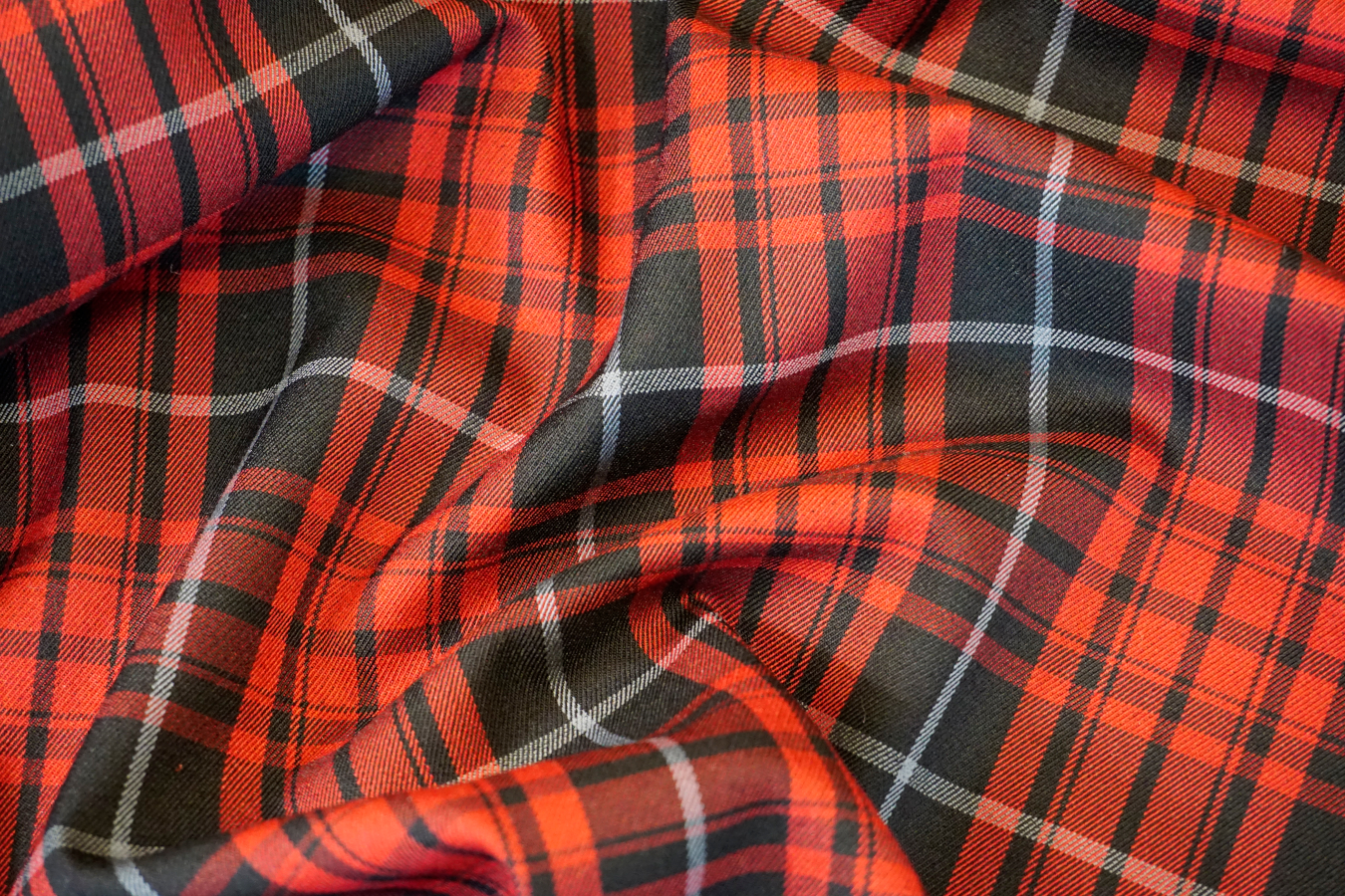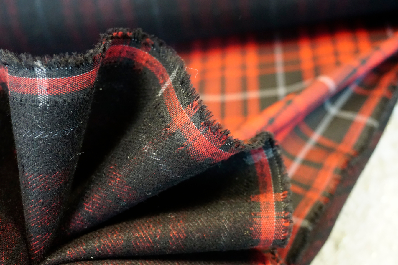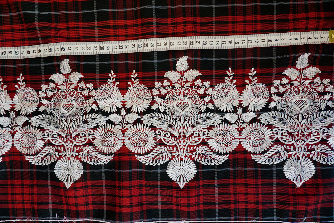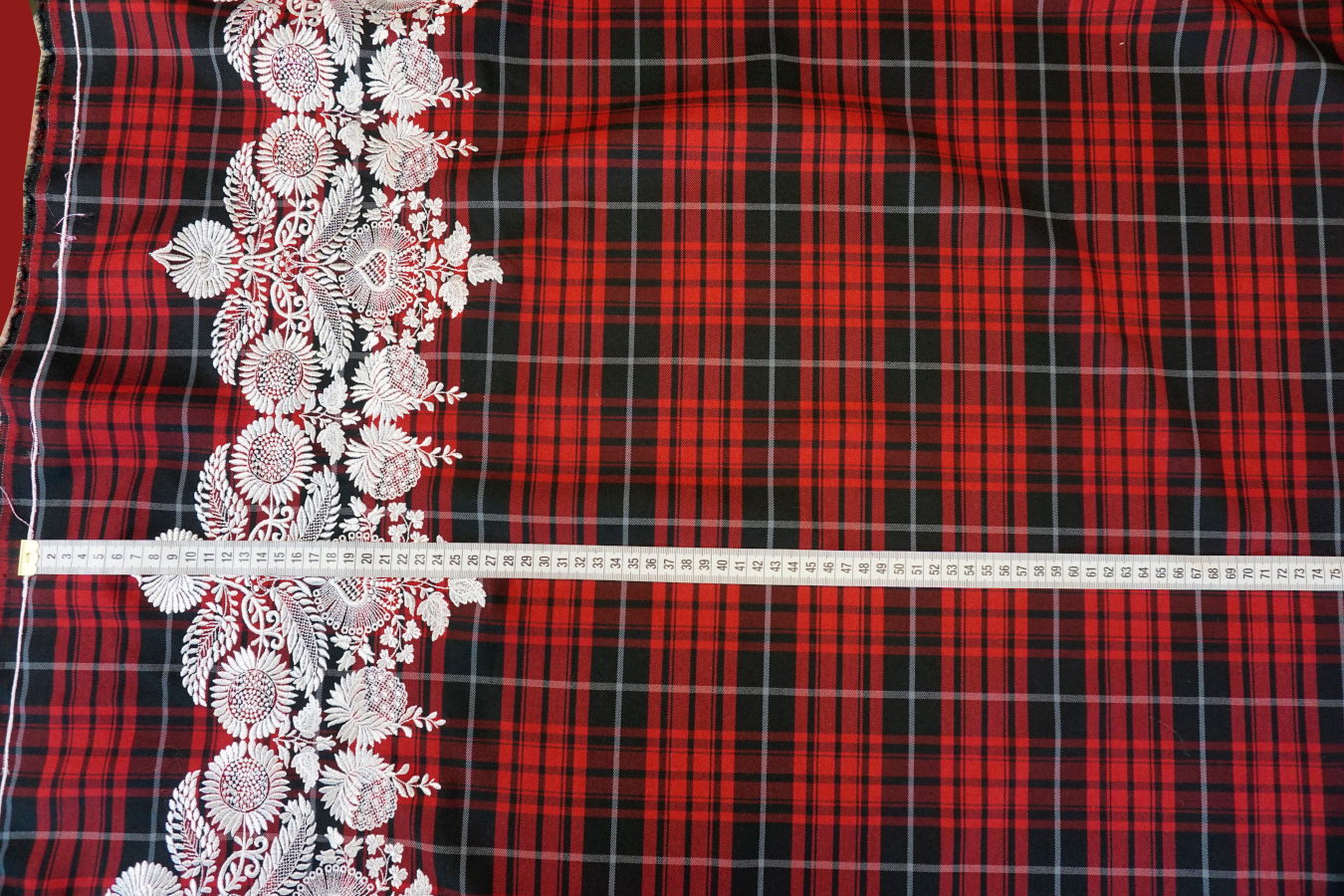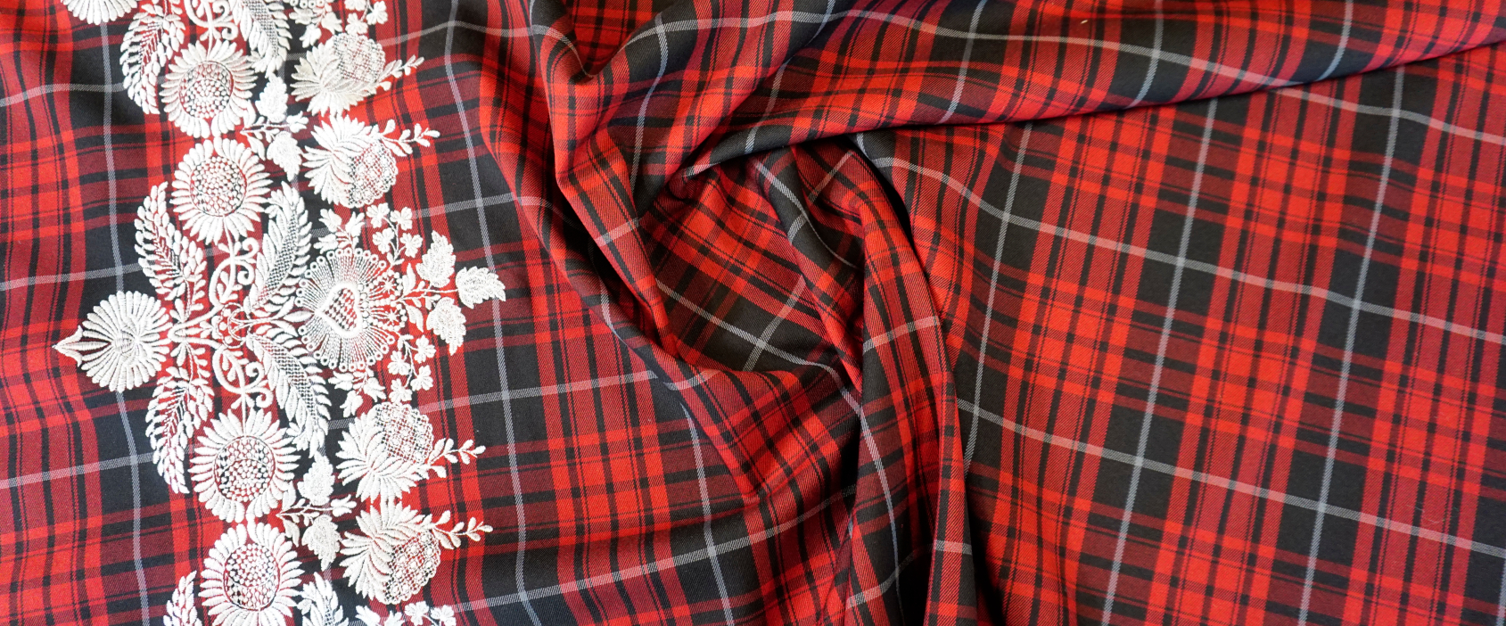 55% Polyester/45% Schurwolle; rückseitig mit Gewebeeinlage versehener leicht elastischer Gabardine in schwarz-rotem Schottenmuster mit einseitiger floraler Stickereibordüre an einer Seite (sechs cm von der Webkante, ca 21 cm hoch); Breite 139 cm; geeignet für winterliche Kleider, Röcke, Kostüme, Zweiteiler, Jacken, leichte Mäntel