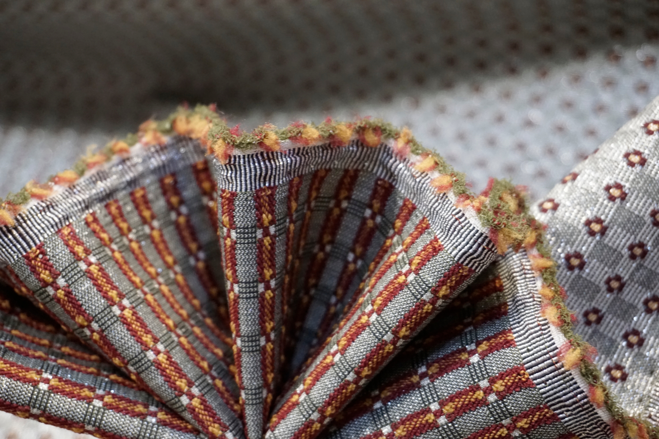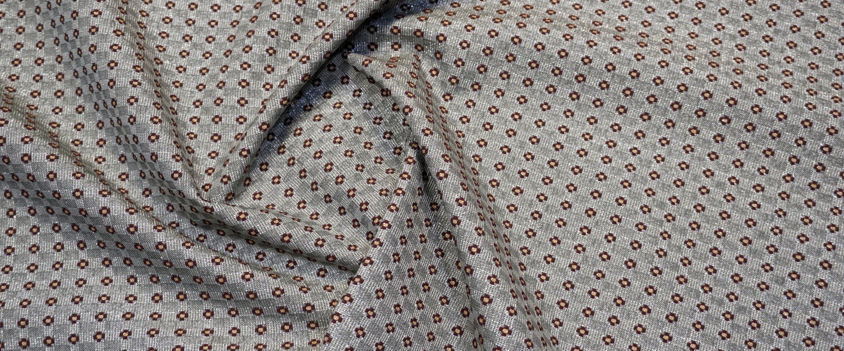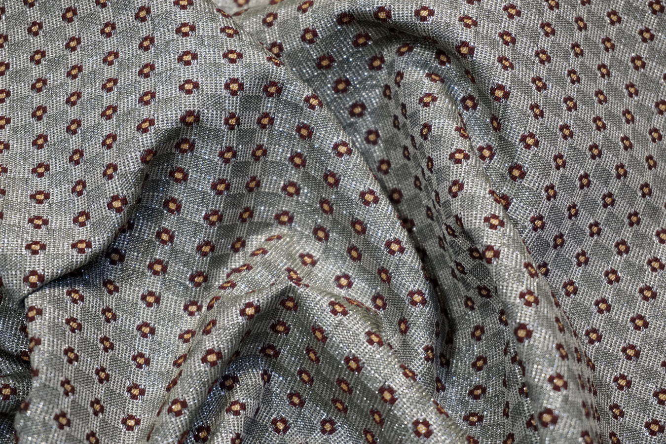 100% Polyester; mit silbernen Glanzfaden; Farbe grau und rot; Breite 140 cm