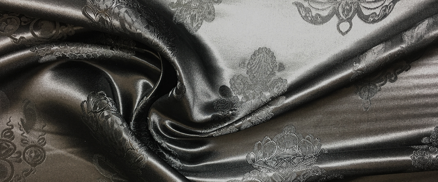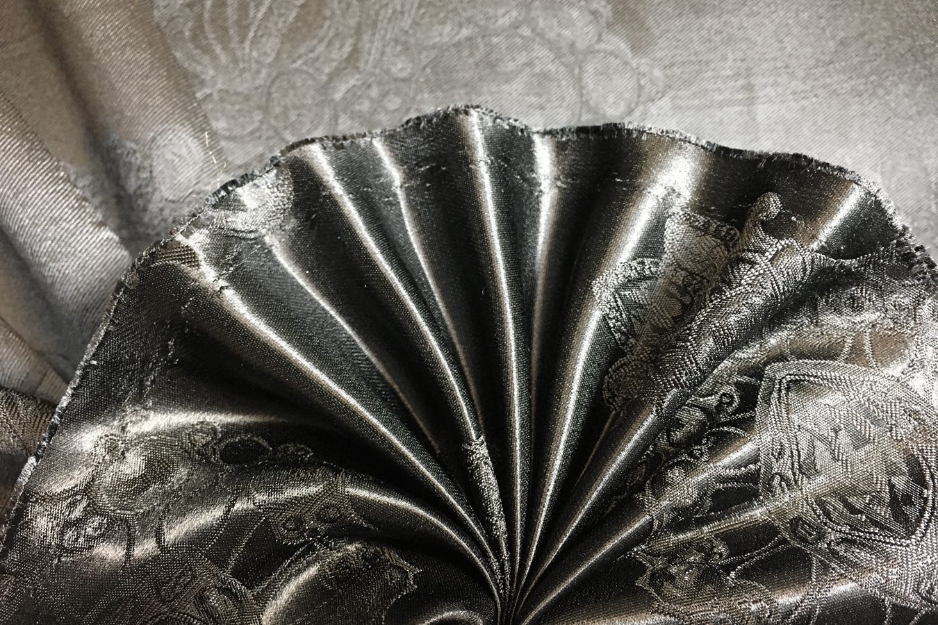 100% Viskose; Satin mit matt eingewebten Broschen; es gibt vier verschiedene Motive, die bis zu 14 x 10 cm groß sind; Farbe tiefschwarz; Breite 148 cm; geeignet für festliche Kleidung, Kleider, Röcke, Kostüme, Hosenanzüge